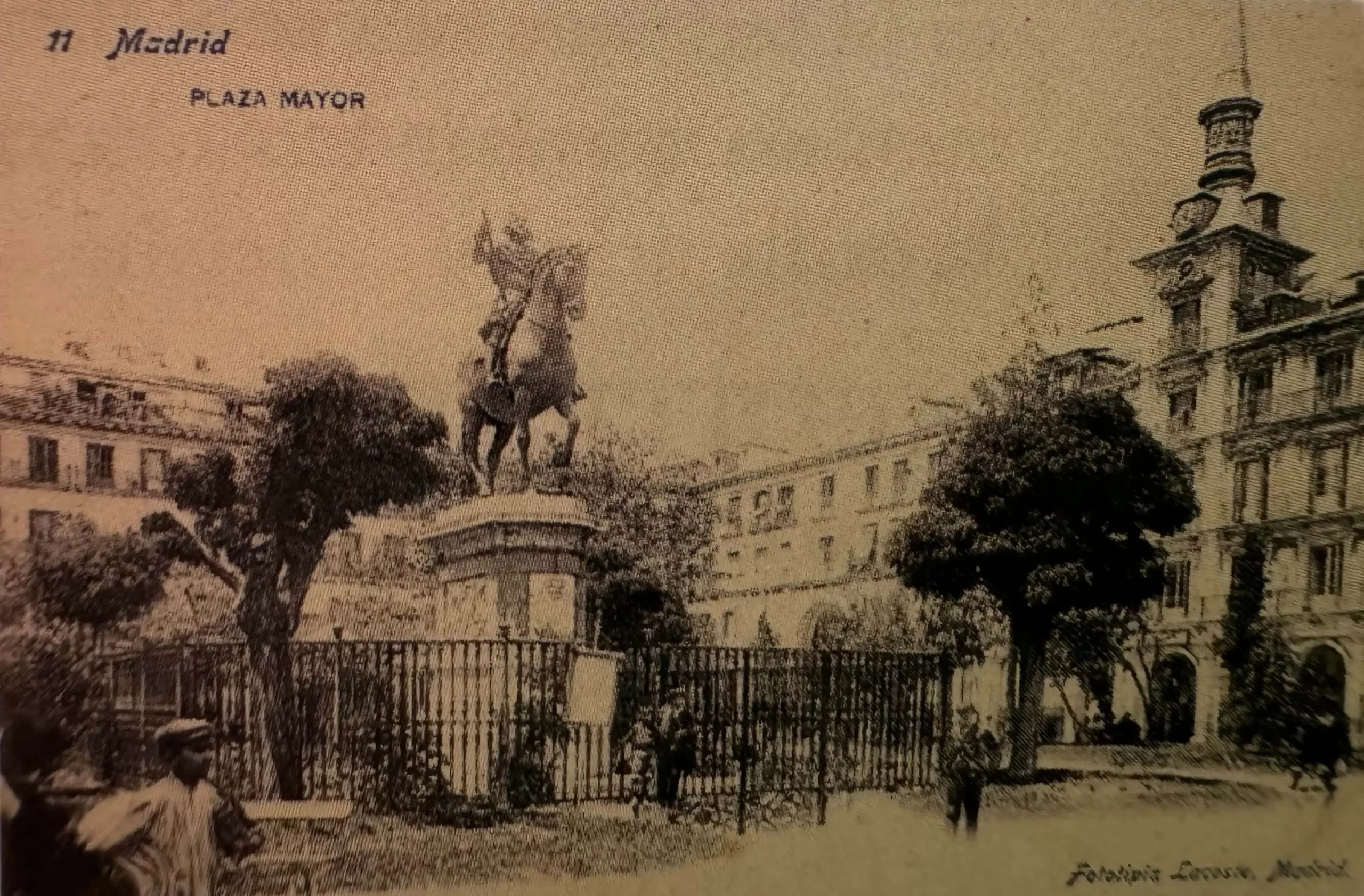 La estatua ecuestre de Felipe III fue realizada por el escultor Juan de Bolonia en 1848, y el pedestal fue obra de Juan José Sánchez Pescador.