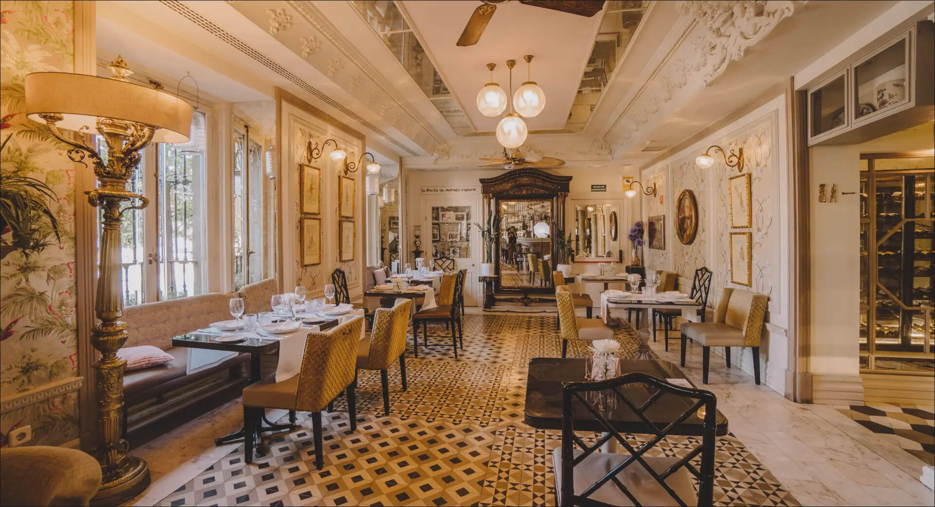 Sofisticado restaurante con terraza acristalada enfrente del Palacio Real que sirve café, tapas y postres.